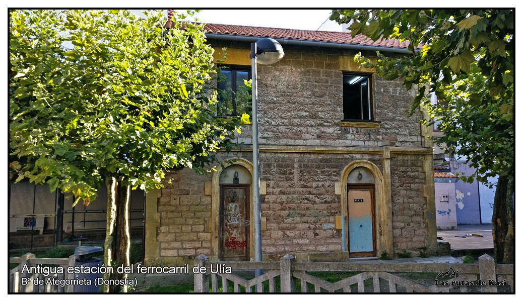 La ruta arranca en el reloj de Ategorrieta. Cruzamos la carretera y seguimos por el Paseo Bordatxipi. Enseguida, a mano izquierda, entre un bolatoki y un frontón, aparece un pequeño edificio: la antigua estación del ferrocarril de Ulía.