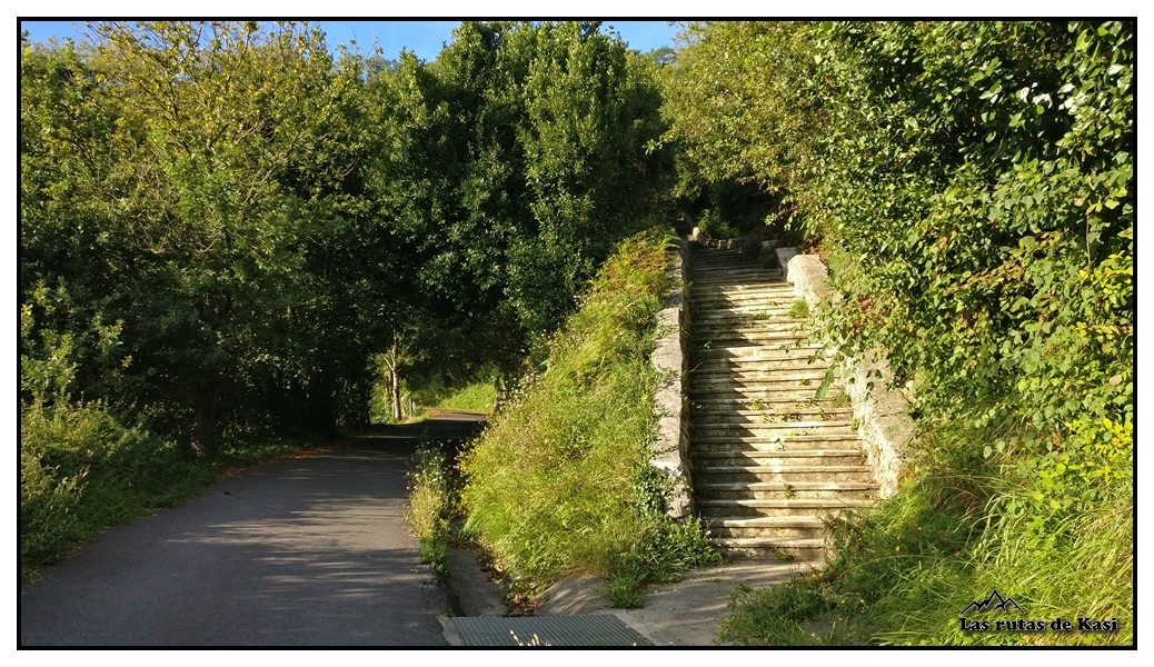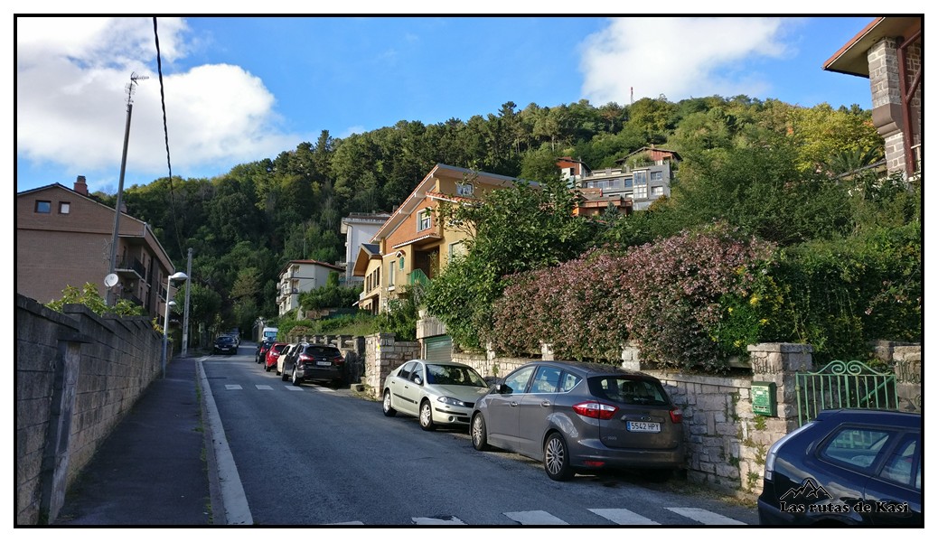 Llegamos a la ladera del monte y la pendiente se suaviza. Donde terminan los edificios la circulación de vehículos parece que ya no está permitida; un par de bolardos impiden la entrada de grandes vehículos.