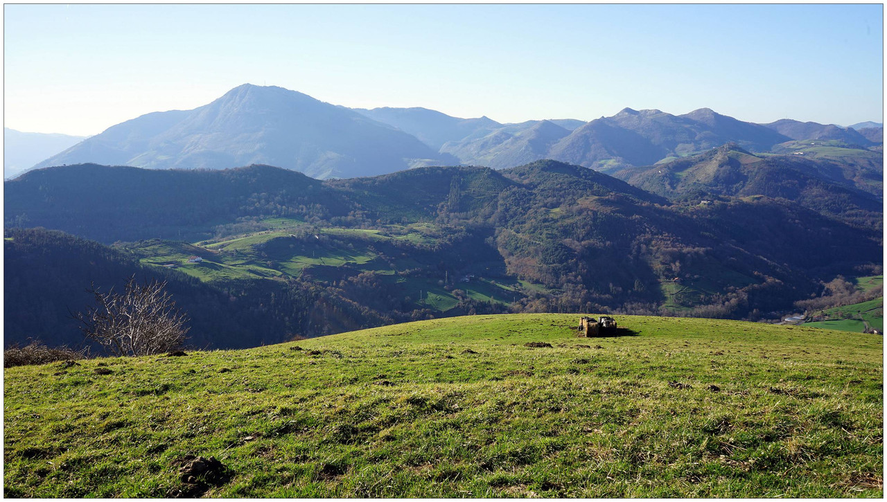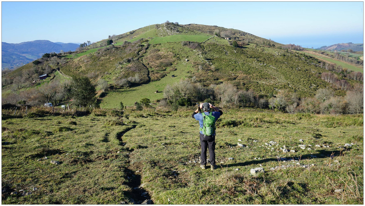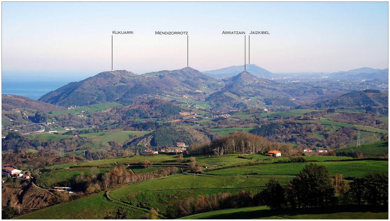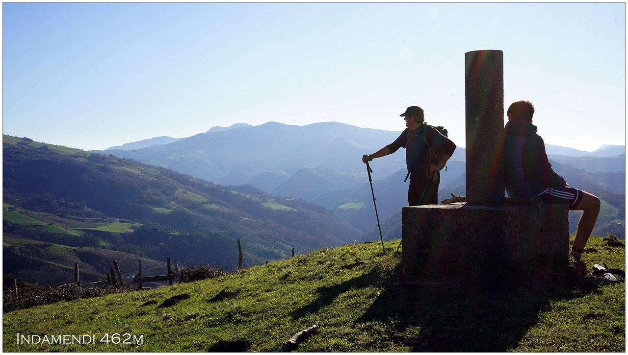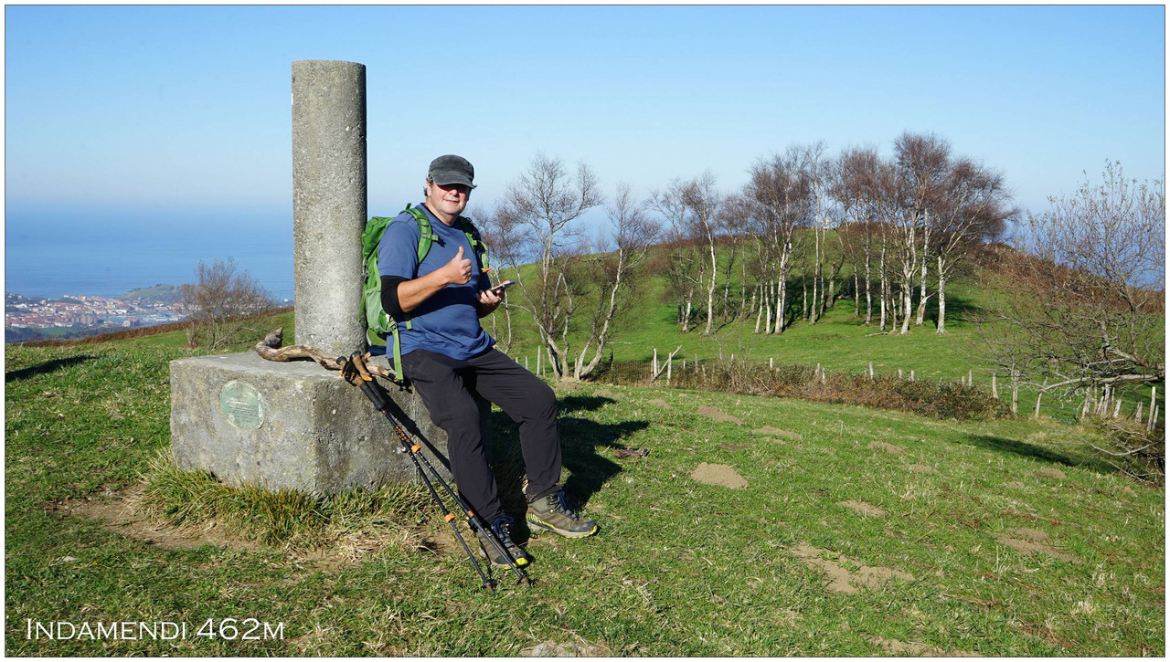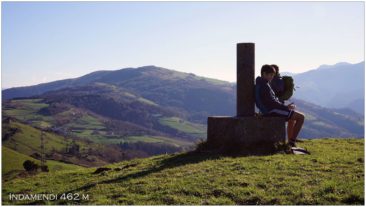 Continuamos ganando altura hasta encontrar, por nuestra izquierda, un sendero claro que se dirige sin concesiones hacia la cima del monte Indamendi (462 m), coronada por un vértice geodésico. Esta cumbre pertenece al macizo de Pagoeta, integrado a su vez en el ámbito montañoso de Hernio, y actúa como un excelente mirador natural.