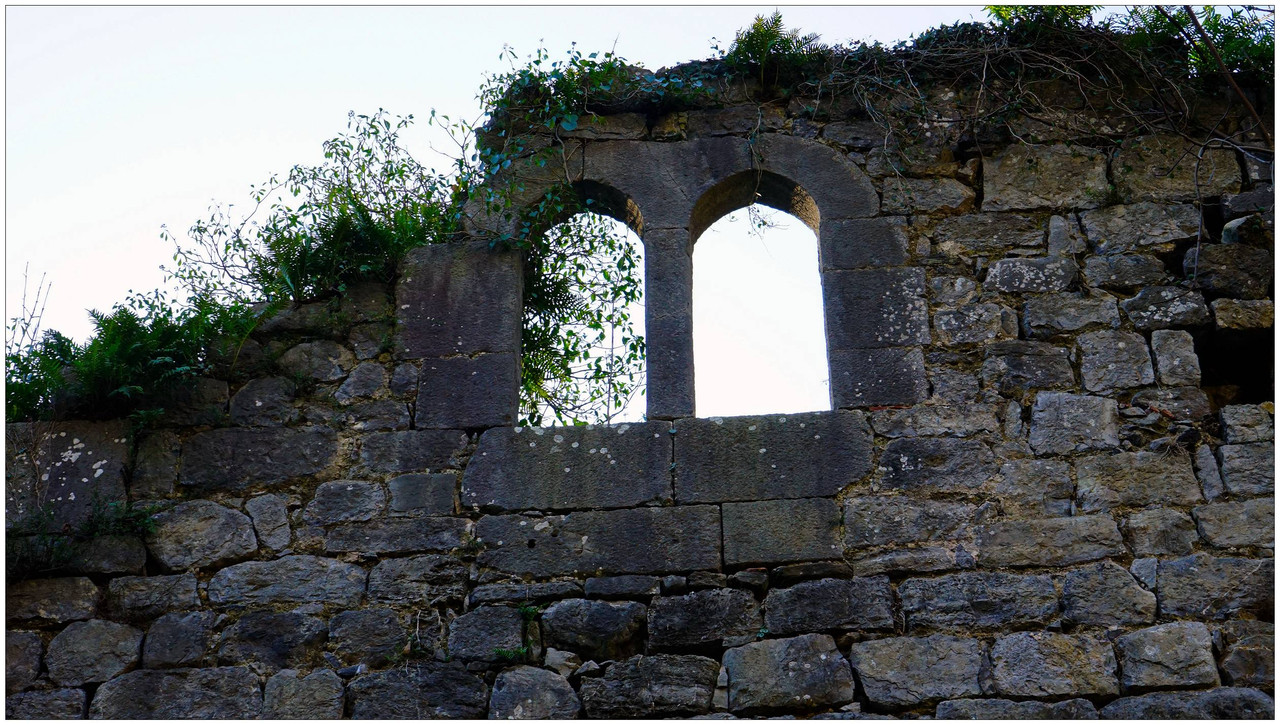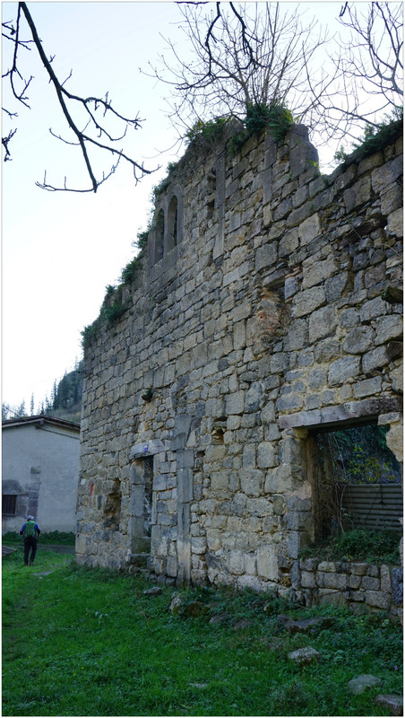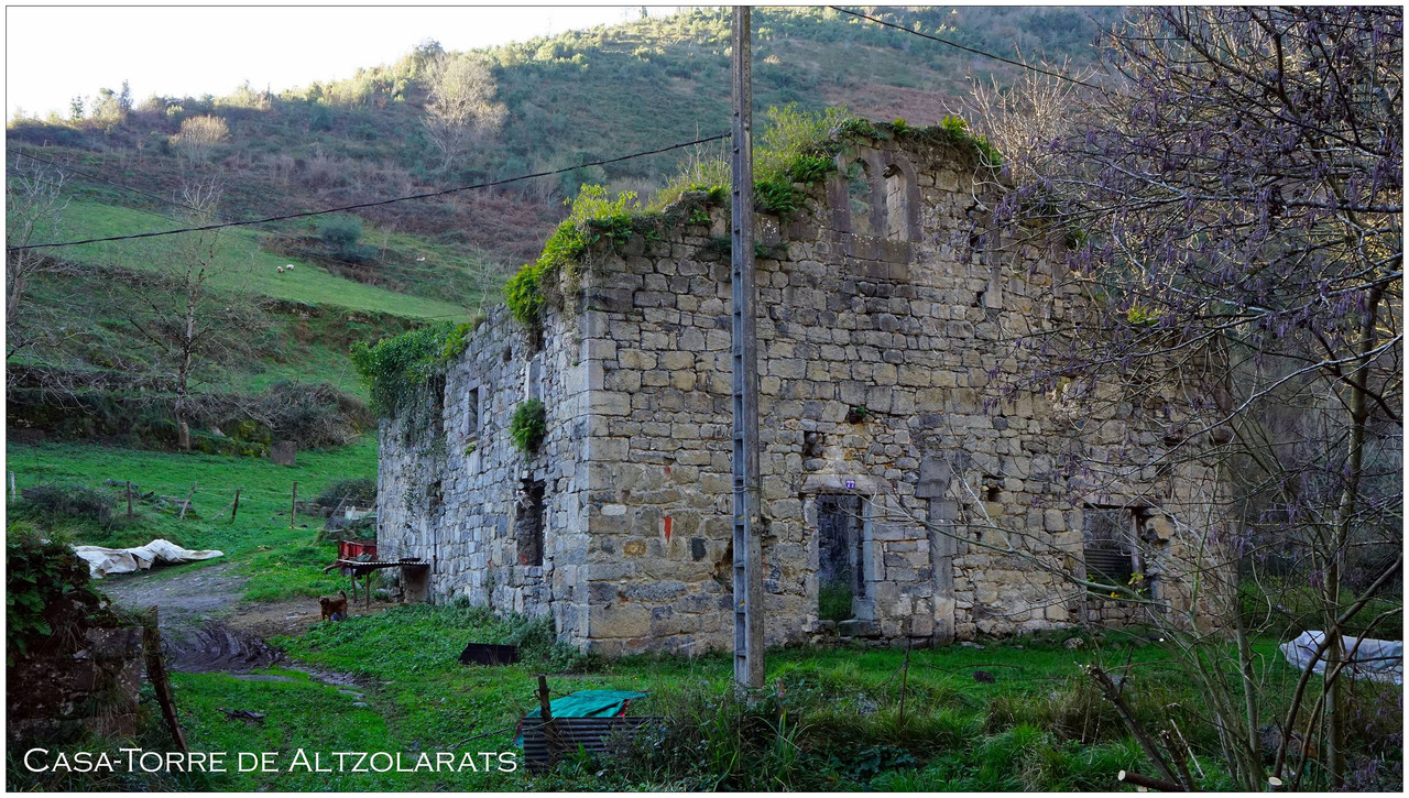Ya en el fondo del valle alcanzamos la pista principal y giramos a la izquierda para remontar ligeramente hasta las ruinas de la Casa-Torre de Altzolaras, en Zestoa. Se trata de un edificio de estilo gótico y severo, levantado en el siglo XV, hoy sin tejado debido a un incendio, pero con sus muros y vanos de piedra aún visibles entre la vegetación. Junto a ella se encuentra el caserío Errota-txiki y un bonito puente de piedra.