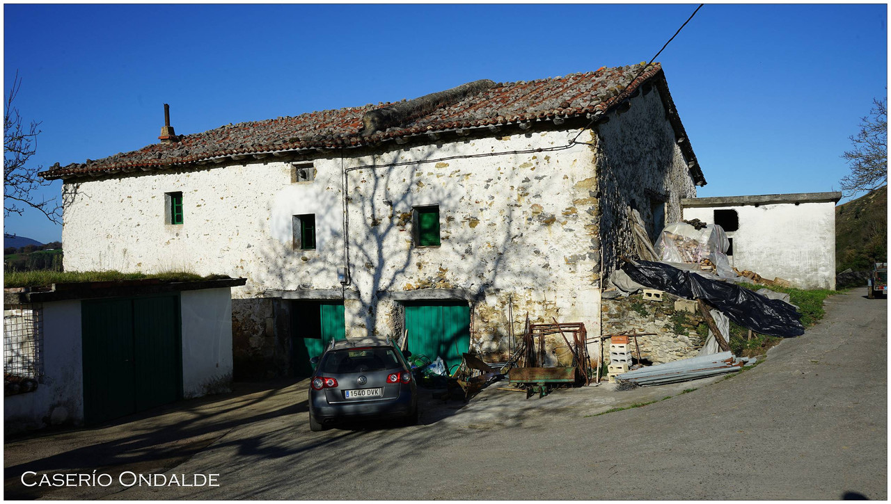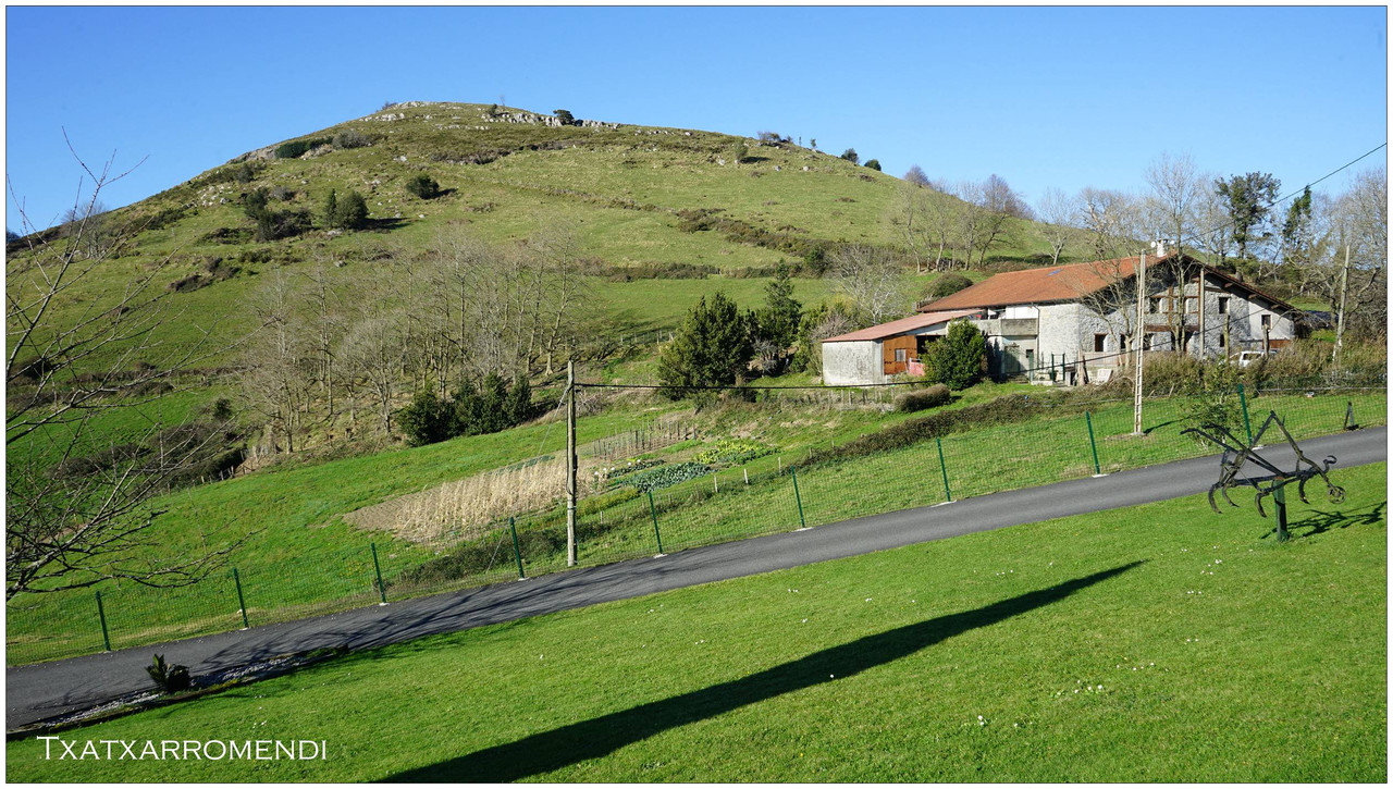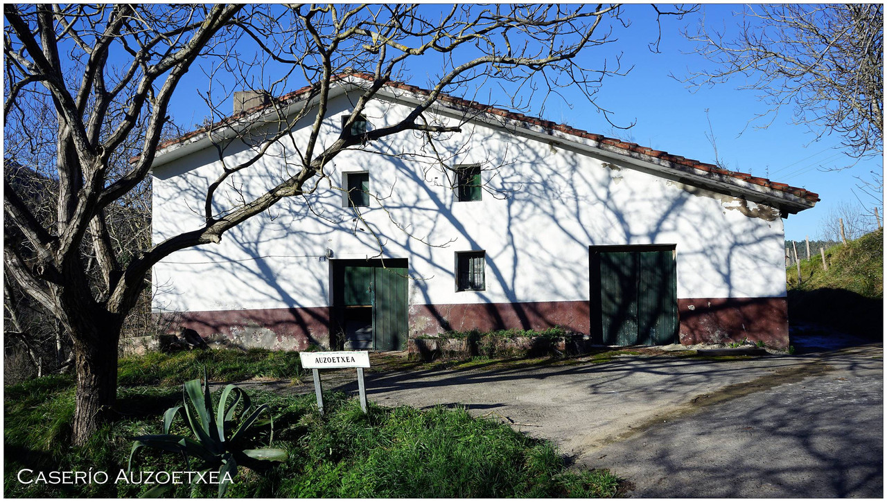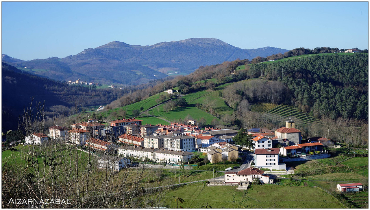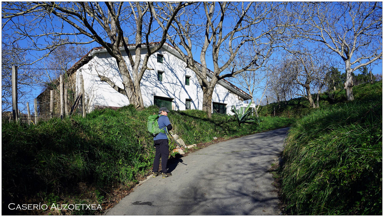 A partir de aquí el camino no da tregua. Comenzamos una subida constante que nos lleva primero junto al caserío Auzoetxea, y más arriba junto a Ondalde. El siguiente en aparecer, ya en torno a los 200 metros de altitud, es el caserío Goikoetxea. Desde este tramo las vistas empiezan a abrirse, con Aizarnazabal a nuestros pies y, al fondo, los macizos de Izarraitz, con la inconfundible silueta del Erlo, y el macizo de Andutz.
