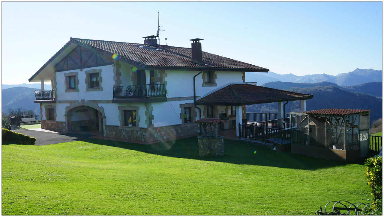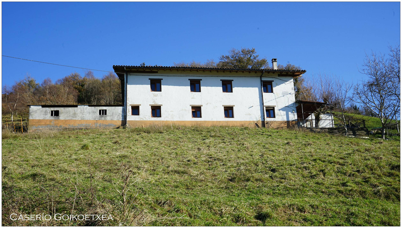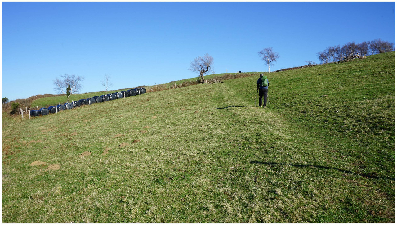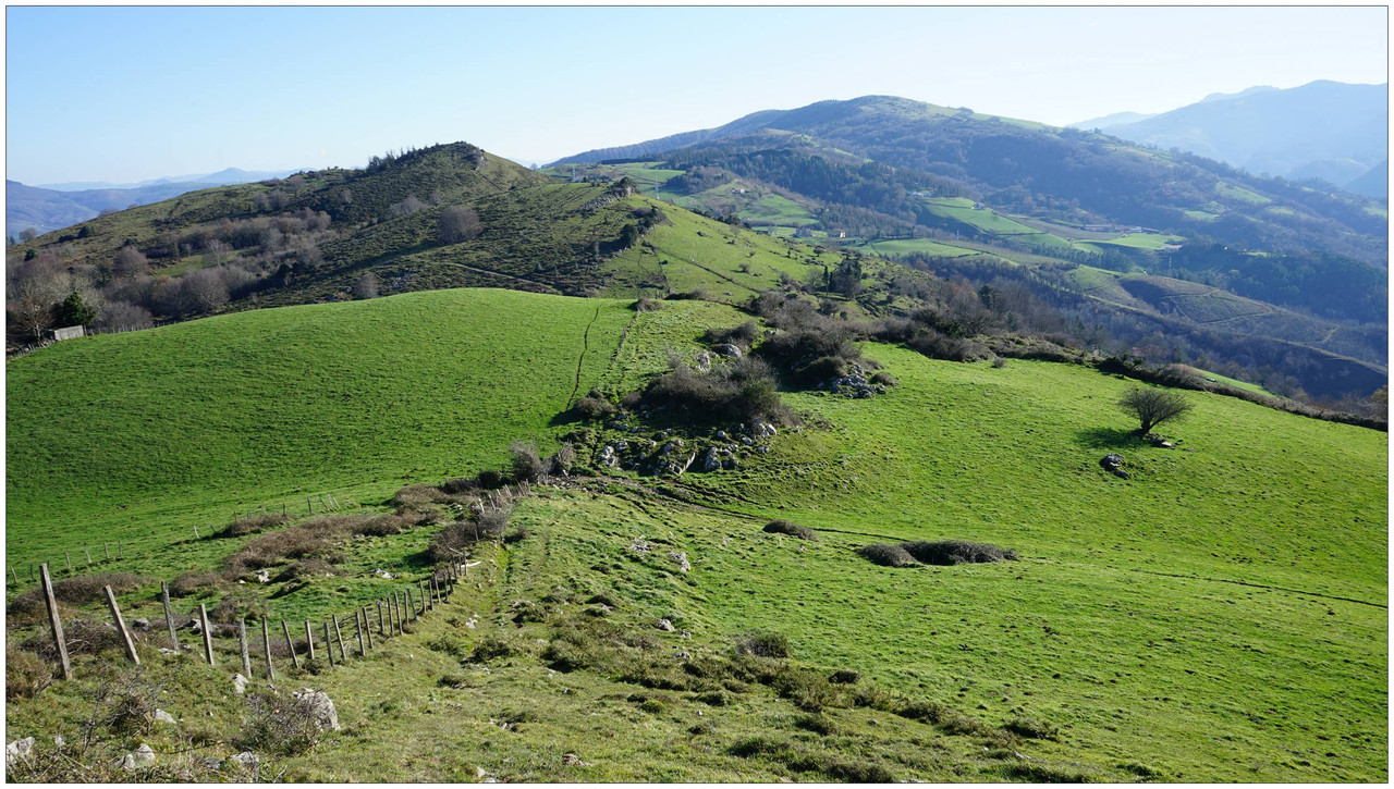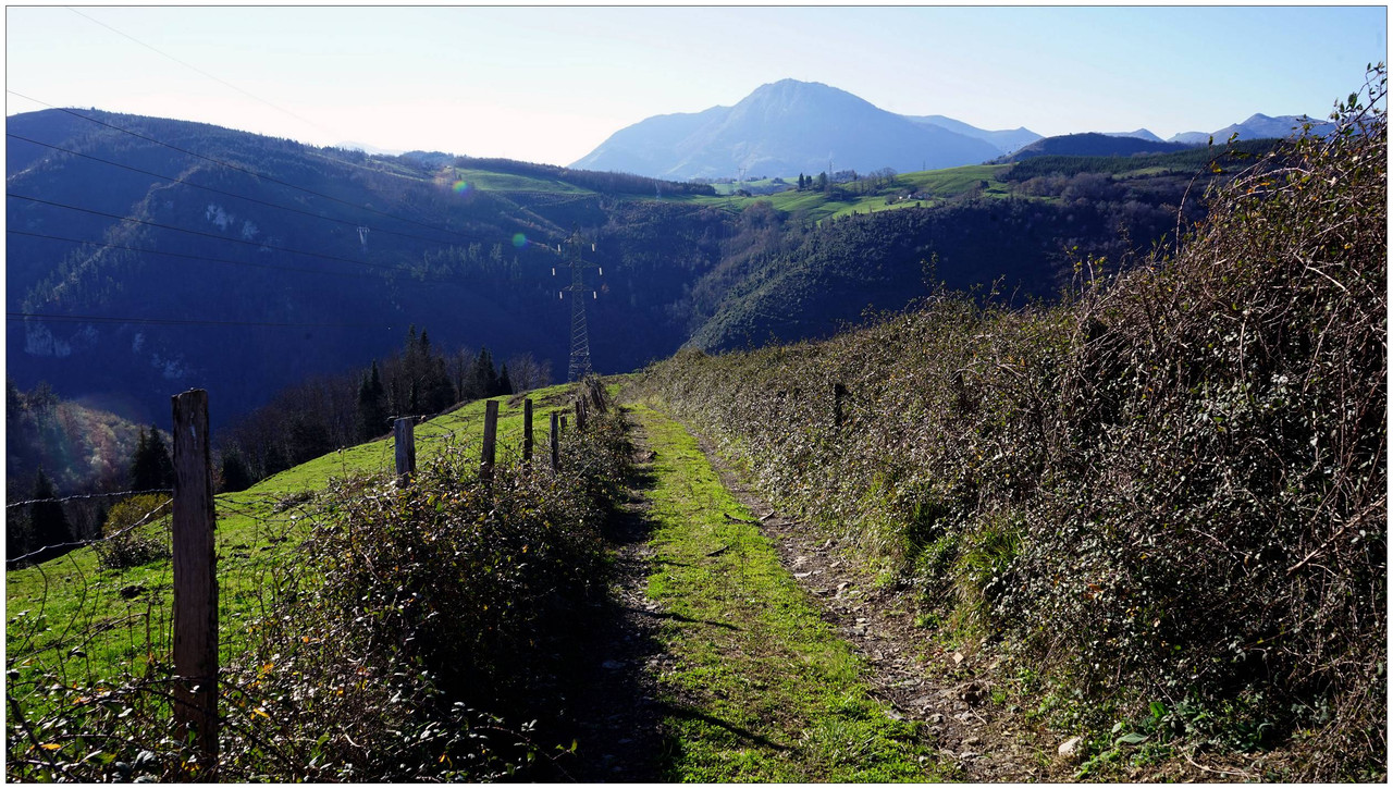 A partir de aquí el camino no da tregua. Comenzamos una subida constante que nos lleva primero junto al caserío Auzoetxea, y más arriba junto a Ondalde. El siguiente en aparecer, ya en torno a los 200 metros de altitud, es el caserío Goikoetxea. Desde este tramo las vistas empiezan a abrirse, con Aizarnazabal a nuestros pies y, al fondo, los macizos de Izarraitz, con la inconfundible silueta del Erlo, y el macizo de Andutz.