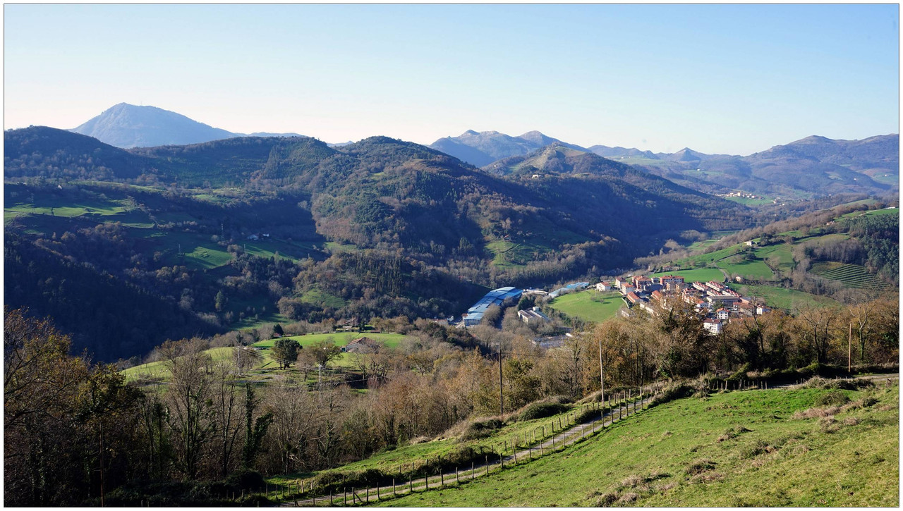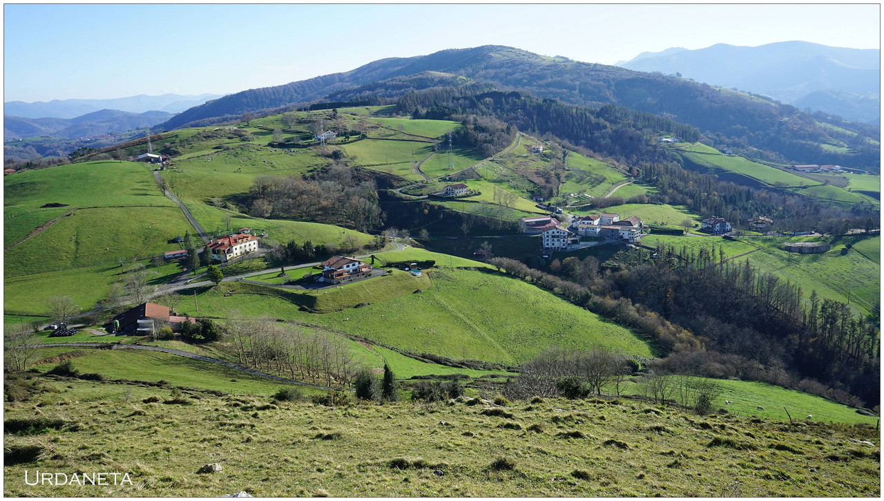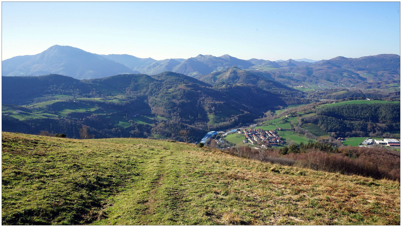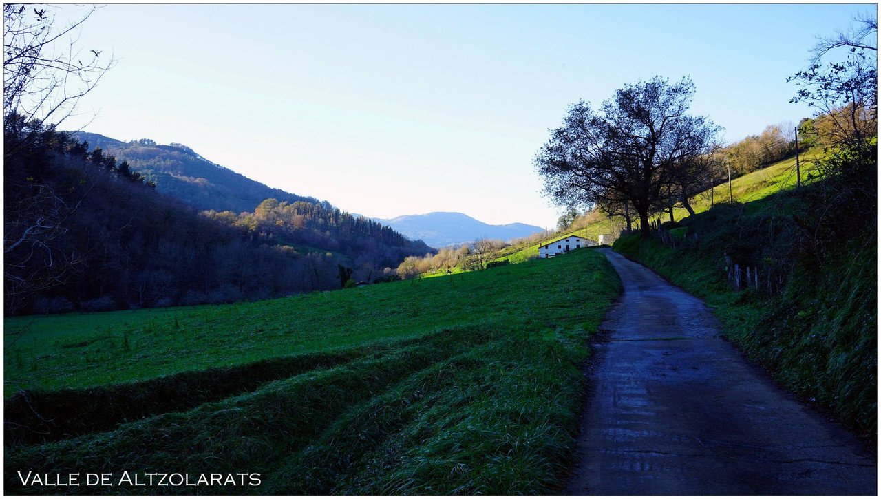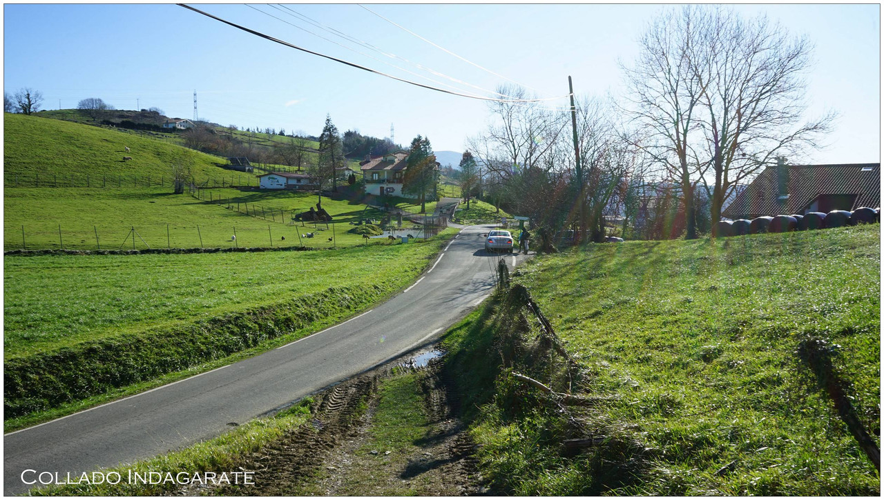 Iniciamos el descenso hacia el collado de Indagarate (370 m), ya en el barrio de Urdaneta (Aia). Al llegar al collado enlazamos con la carretera y la seguimos hasta el núcleo de Urdaneta. El bar-restaurante Izarra lo encontramos cerrado, así que seguimos adelante y comenzamos el descenso hacia el valle de Altzolarats por un camino que discurre bajo una línea eléctrica y traza varias zetas en su tramo final. Salvamos aquí unos 280 metros de desnivel, una bajada notable.