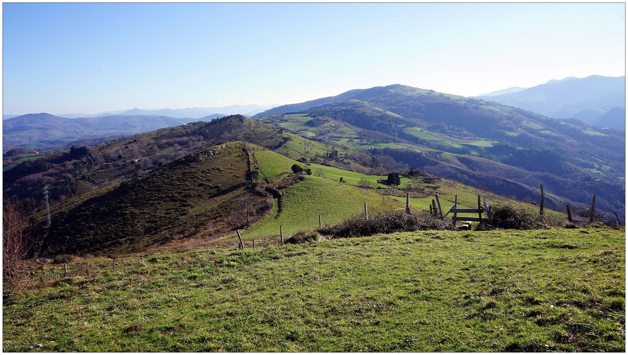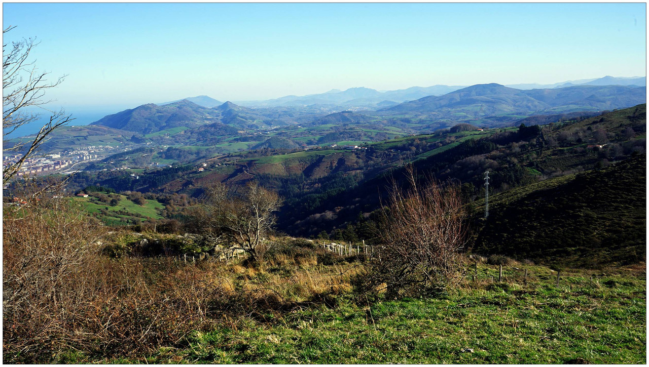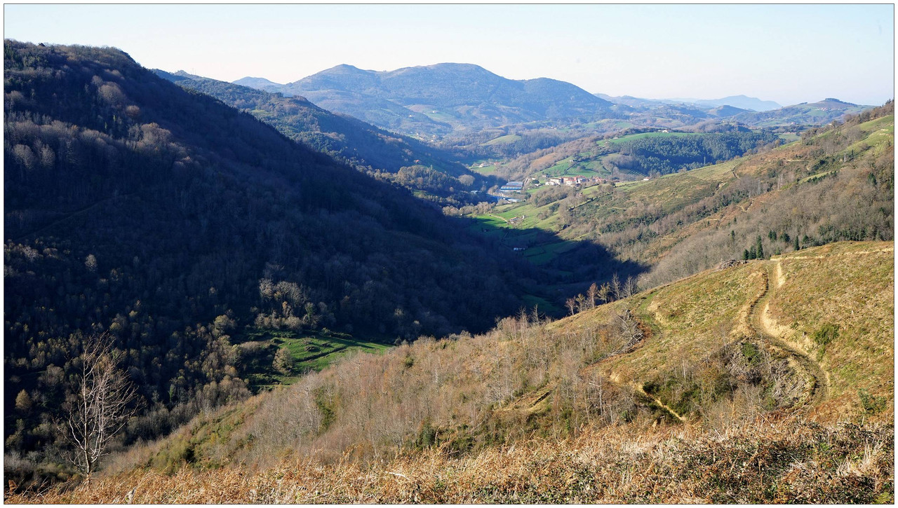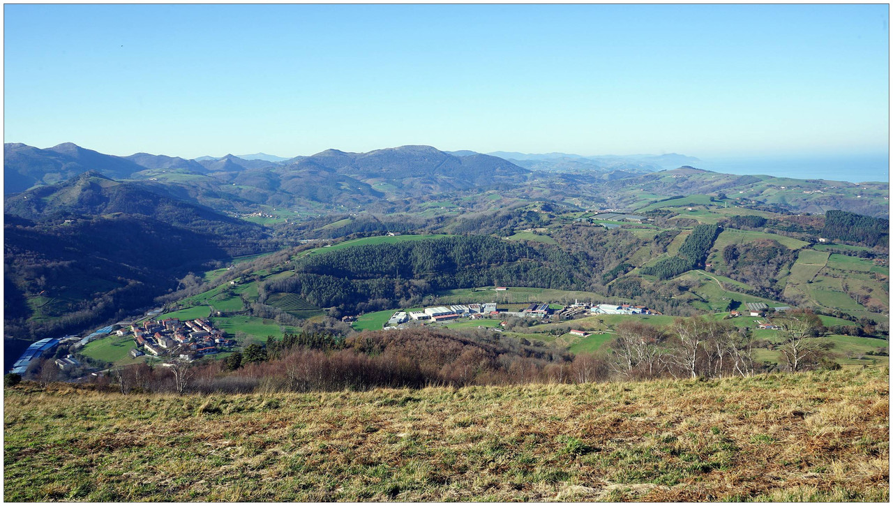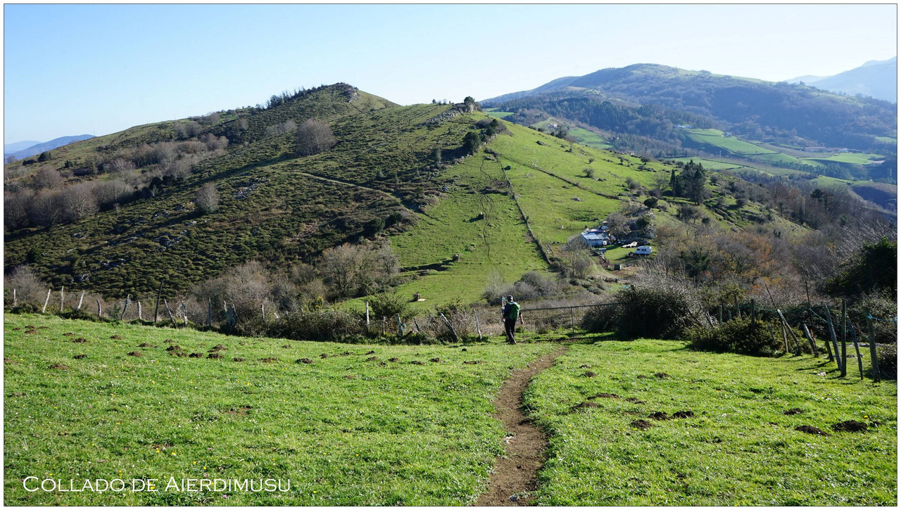 Iniciamos el descenso hacia el collado de Indagarate (370 m), ya en el barrio de Urdaneta (Aia). Al llegar al collado enlazamos con la carretera y la seguimos hasta el núcleo de Urdaneta. El bar-restaurante Izarra lo encontramos cerrado, así que seguimos adelante y comenzamos el descenso hacia el valle de Altzolarats por un camino que discurre bajo una línea eléctrica y traza varias zetas en su tramo final. Salvamos aquí unos 280 metros de desnivel, una bajada notable.