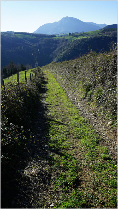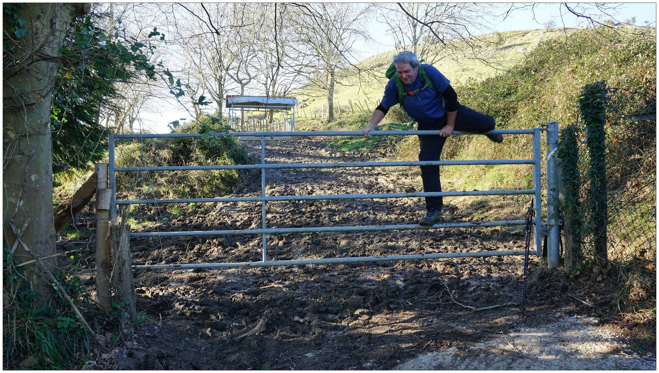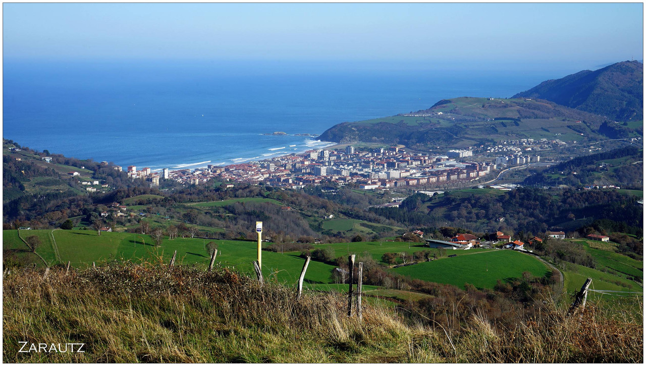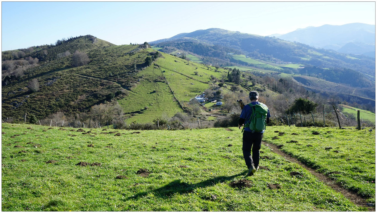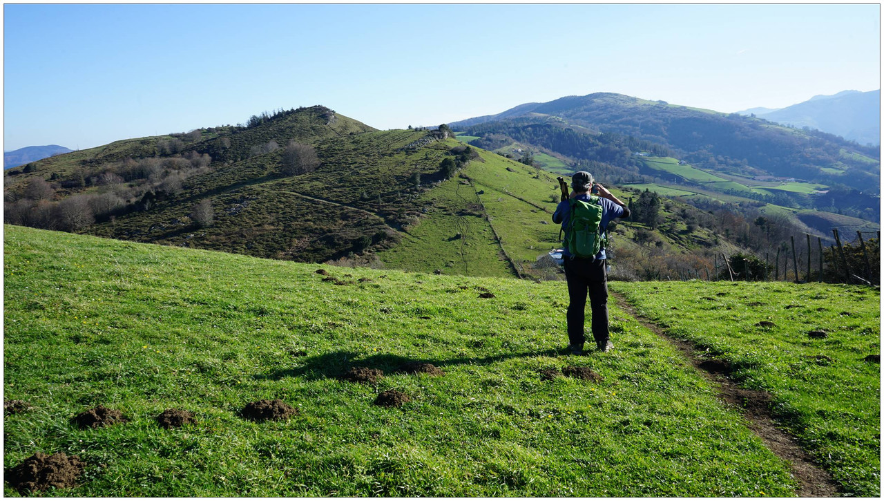 Iniciamos el descenso hacia el collado de Indagarate (370 m), ya en el barrio de Urdaneta (Aia). Al llegar al collado enlazamos con la carretera y la seguimos hasta el núcleo de Urdaneta. El bar-restaurante Izarra lo encontramos cerrado, así que seguimos adelante y comenzamos el descenso hacia el valle de Altzolarats por un camino que discurre bajo una línea eléctrica y traza varias zetas en su tramo final. Salvamos aquí unos 280 metros de desnivel, una bajada notable.