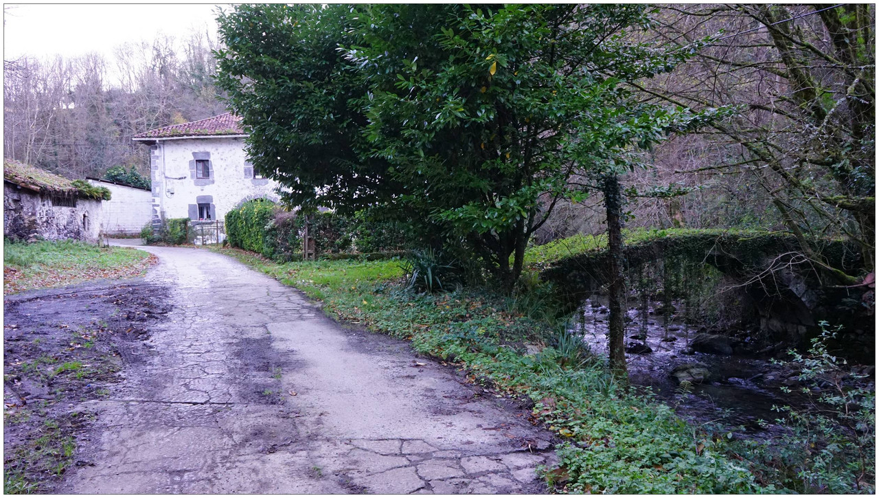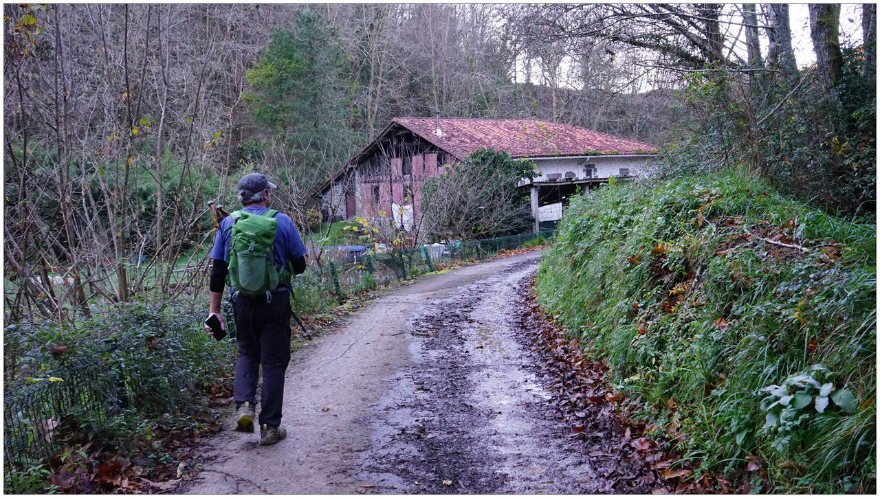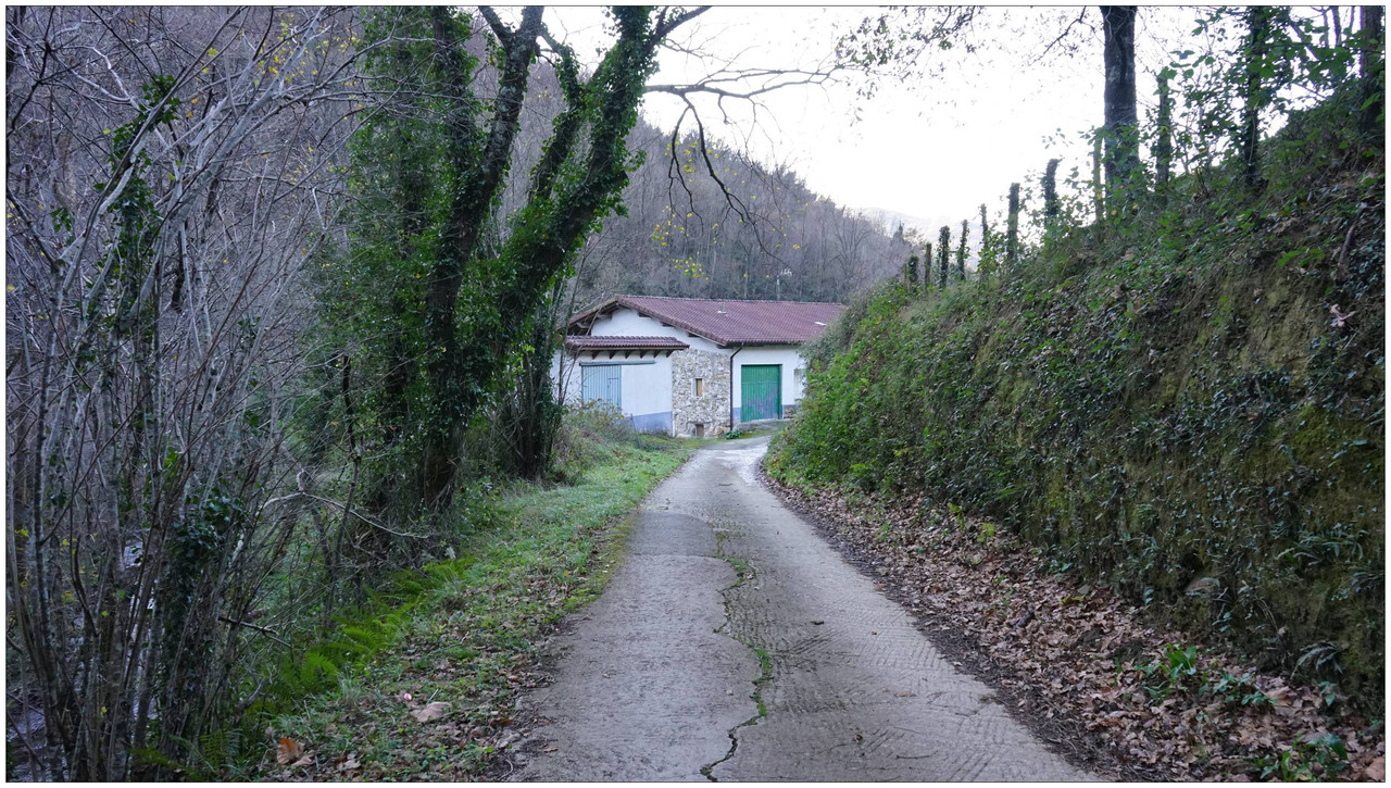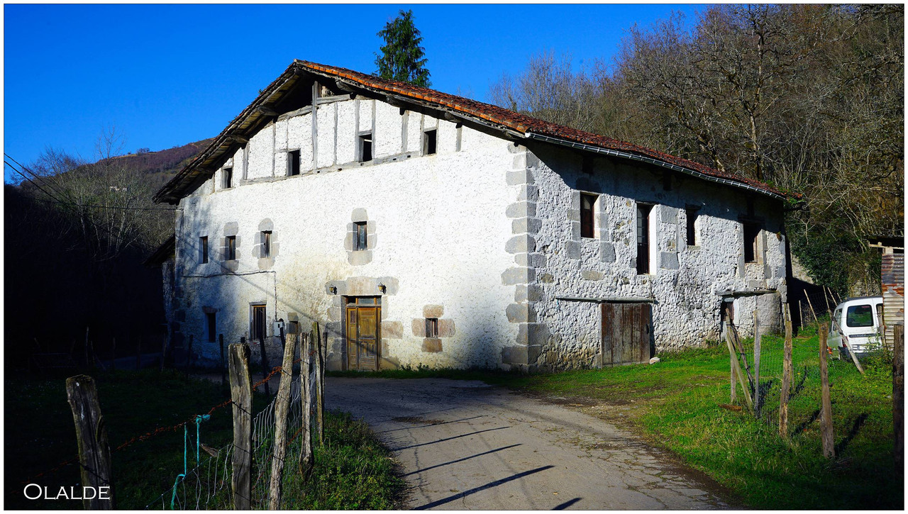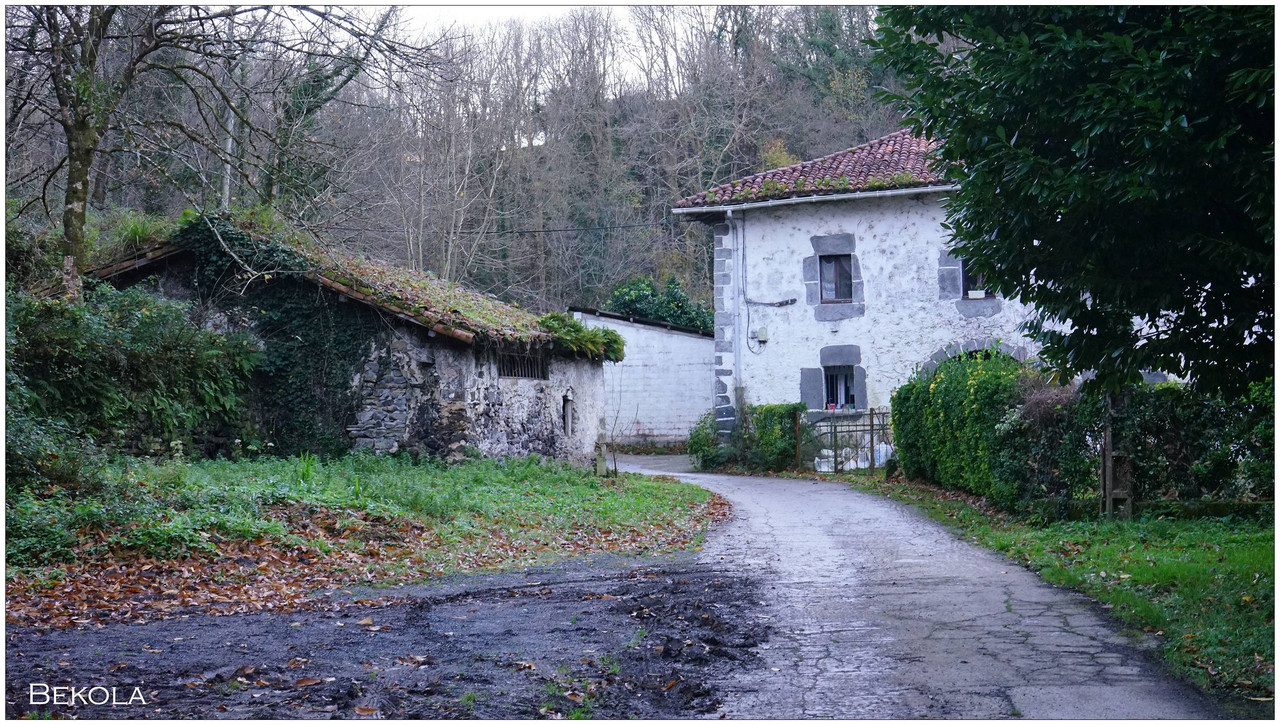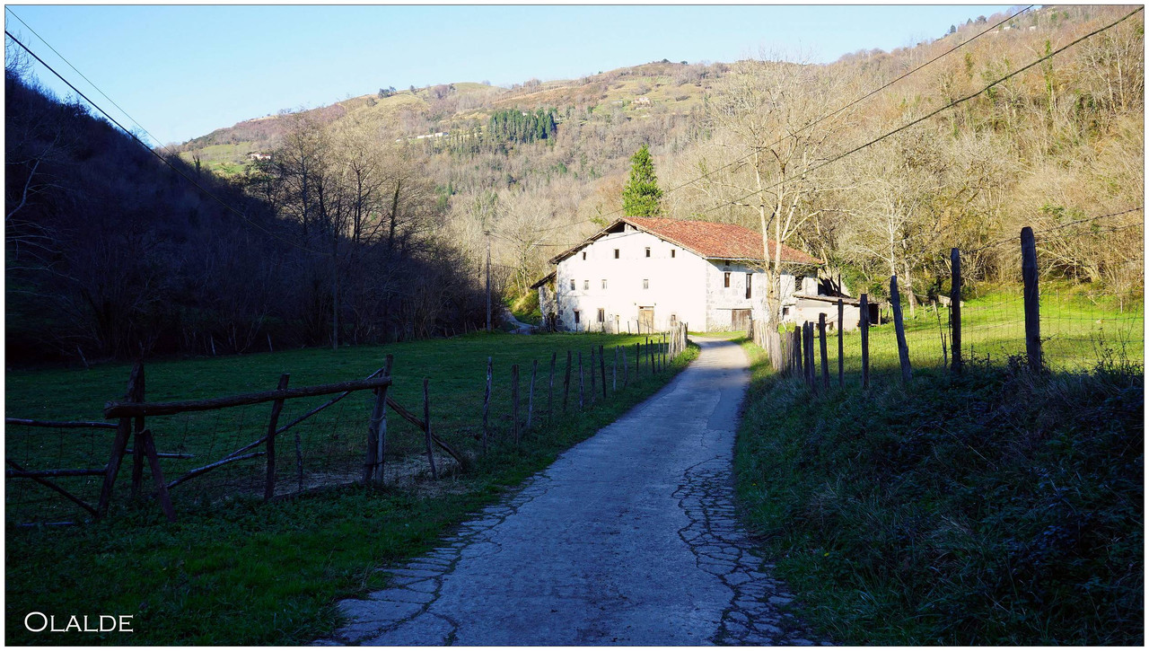 Ahora sí, emprendemos el regreso definitivo a Aizarnazabal siguiendo el Altzolaraspidea, que recorre el fondo del valle, muchas veces junto a la erreka Altzolarats. Pasamos primero junto al caserío Olalde, que da la impresión de estar abandonado. Al asomarnos por una de sus ventanas comprobamos que el interior se encuentra completamente arruinado. En la parte trasera del edificio aparecen unas ruinas invadidas por la vegetación que, por la disposición de sus muros y la presencia en la parte inferior de un arco de piedra, parecen corresponder a un antiguo molino hidráulico, otro ejemplo más del intenso aprovechamiento del agua en este valle.