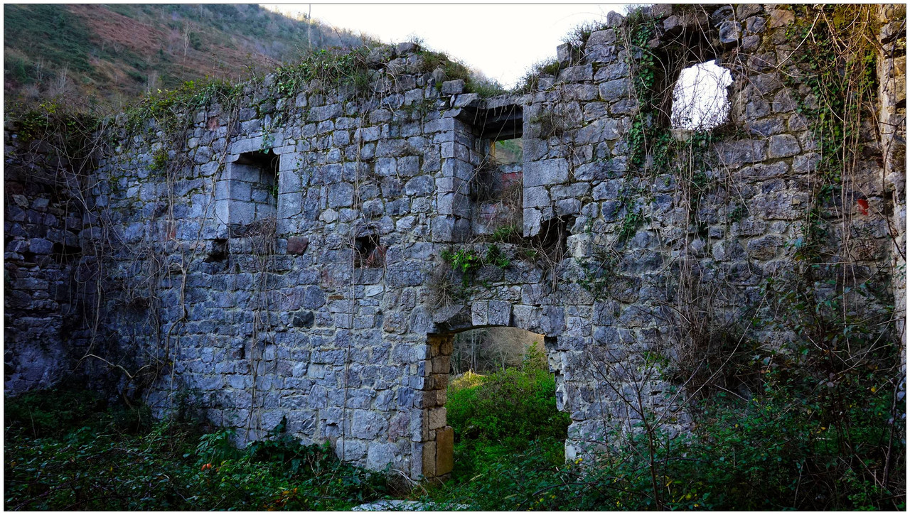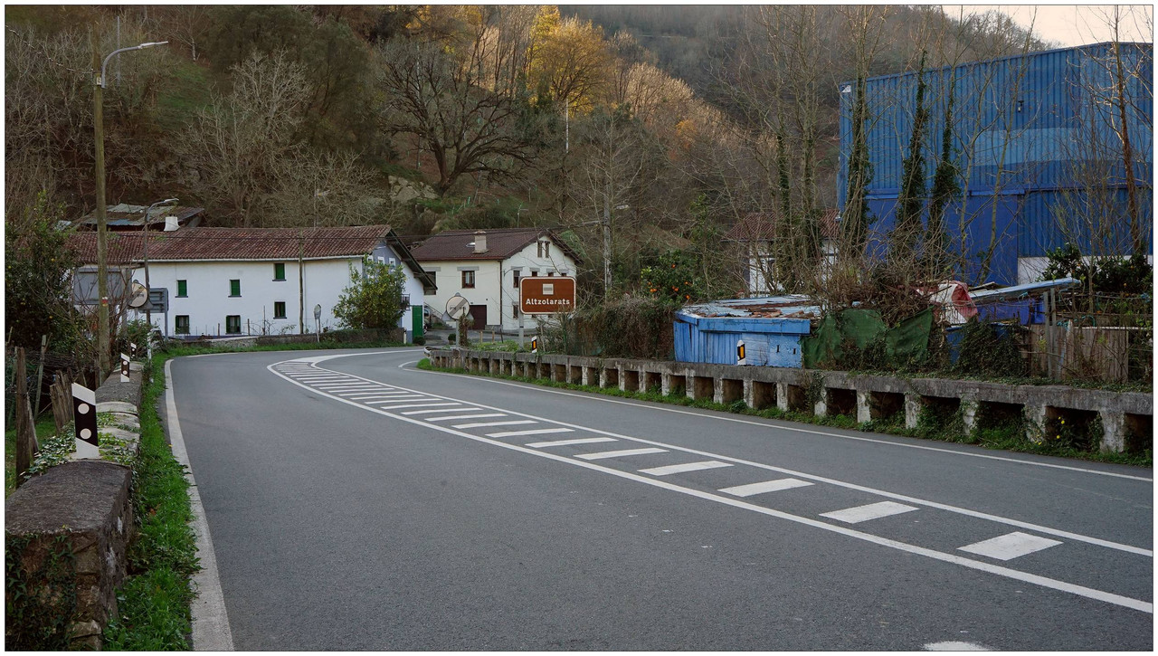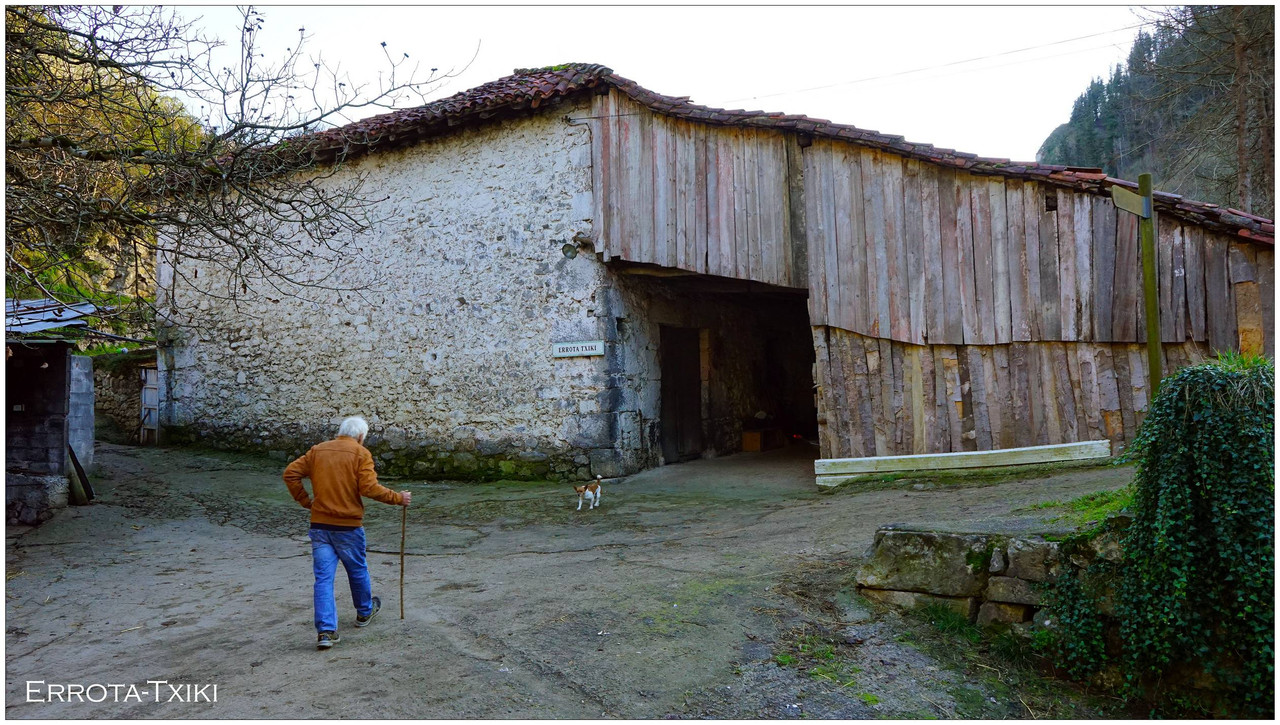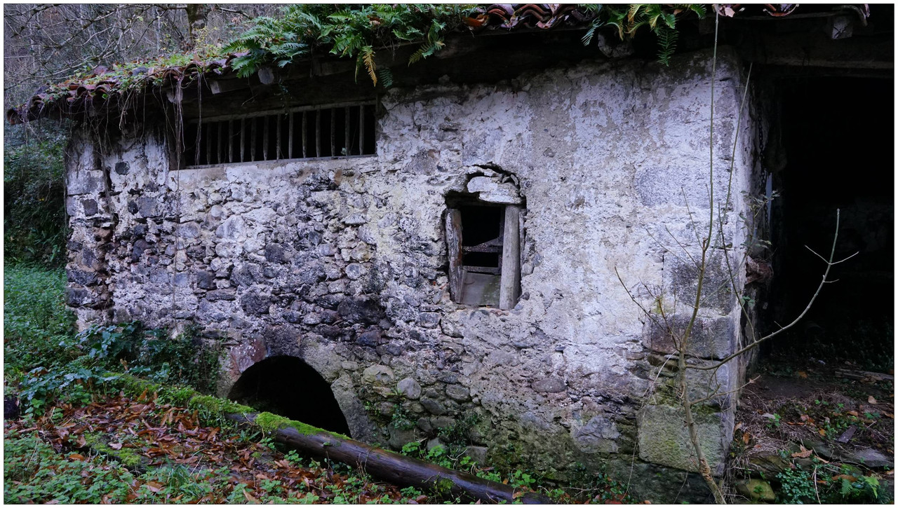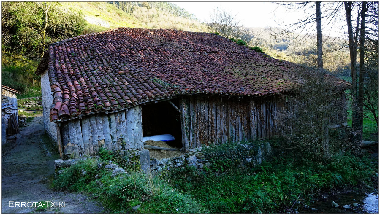 Ahora sí, emprendemos el regreso definitivo a Aizarnazabal siguiendo el Altzolaraspidea, que recorre el fondo del valle, muchas veces junto a la erreka Altzolarats. Pasamos primero junto al caserío Olalde, que da la impresión de estar abandonado. Al asomarnos por una de sus ventanas comprobamos que el interior se encuentra completamente arruinado. En la parte trasera del edificio aparecen unas ruinas invadidas por la vegetación que, por la disposición de sus muros y la presencia en la parte inferior de un arco de piedra, parecen corresponder a un antiguo molino hidráulico, otro ejemplo más del intenso aprovechamiento del agua en este valle.