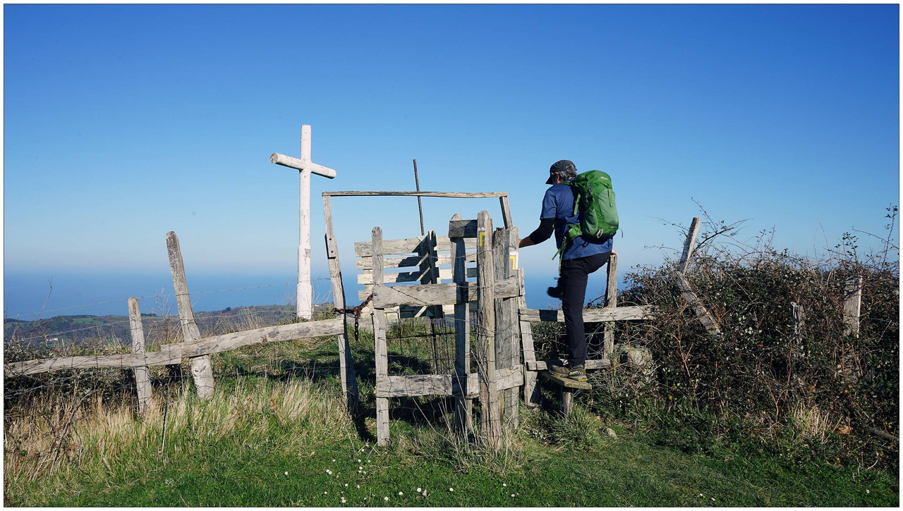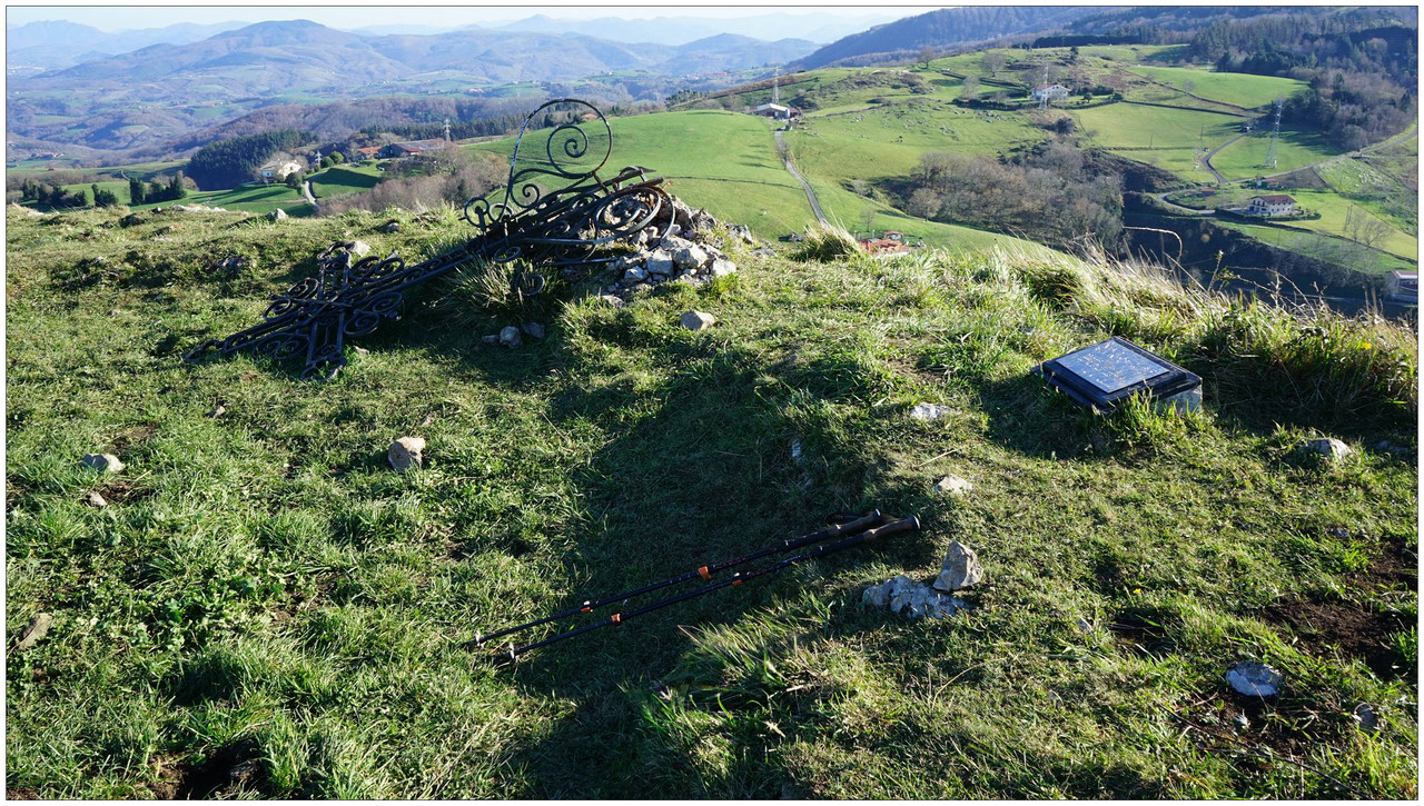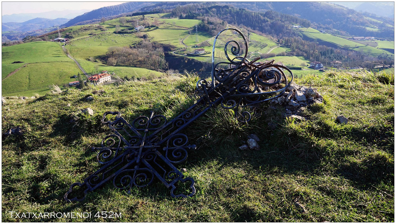 Desde aquí continuamos por el cordal en dirección a Txatxarromendi, pasando junto a la cota de Agiñetazar, cuya cima no alcanzamos al no haber un paso cómodo en la alambrada. El sendero pasa prácticamente a su lado, por lo que no supone una pérdida significativa. Descendemos después al collado de Aierdimusu (363 m), donde encontramos una pequeña borda, y desde allí afrontamos una breve subida a una antecima rocosa antes del ascenso final a la cima de Txatxarromendi (452 m). Aquí encontramos la cruz caída, aparentemente arrancada de su base, en un entorno muy expuesto al viento, que se deja notar con fuerza.