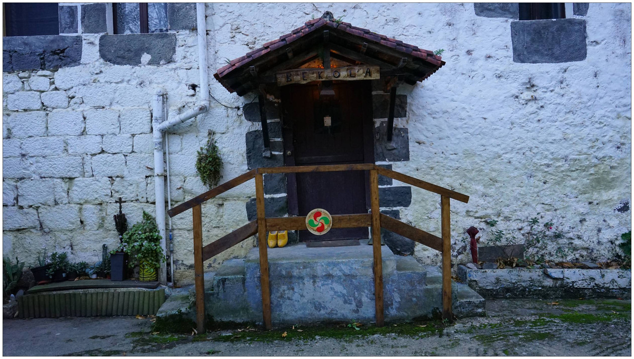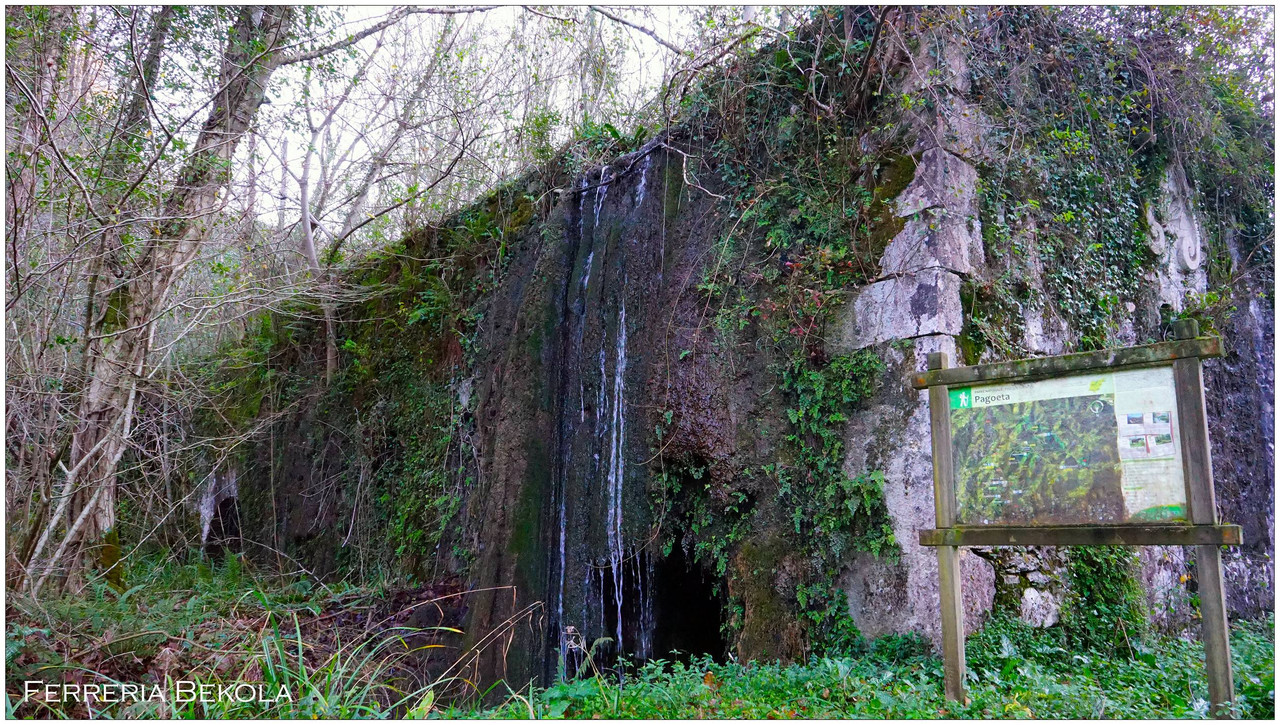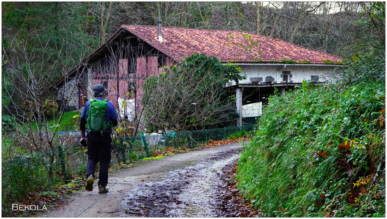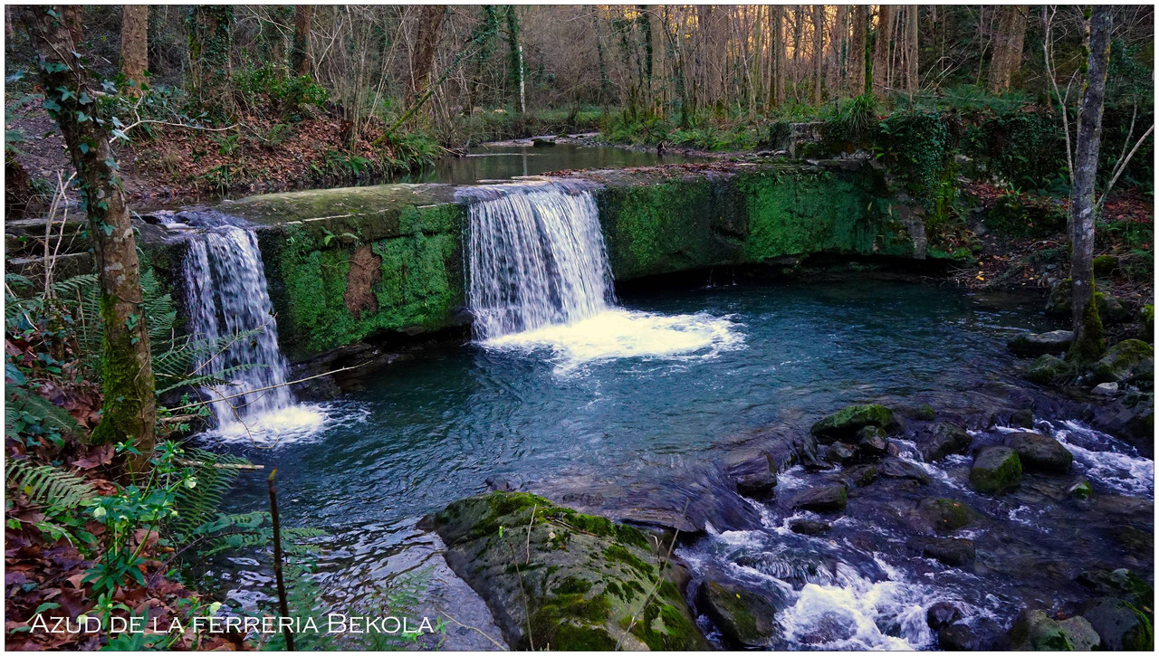 Poco después llegamos a Bekola, donde encontramos uno de los conjuntos más interesantes del recorrido: el azud, el canal de derivación y los restos de la ferrería de Bekola, con su antepara y un escudo de piedra en la fachada que indica el año 1734. Frente al caserío hay una fuente con lavadero y, junto a ella, un potro de herrar, utilizado antiguamente para inmovilizar a los animales.