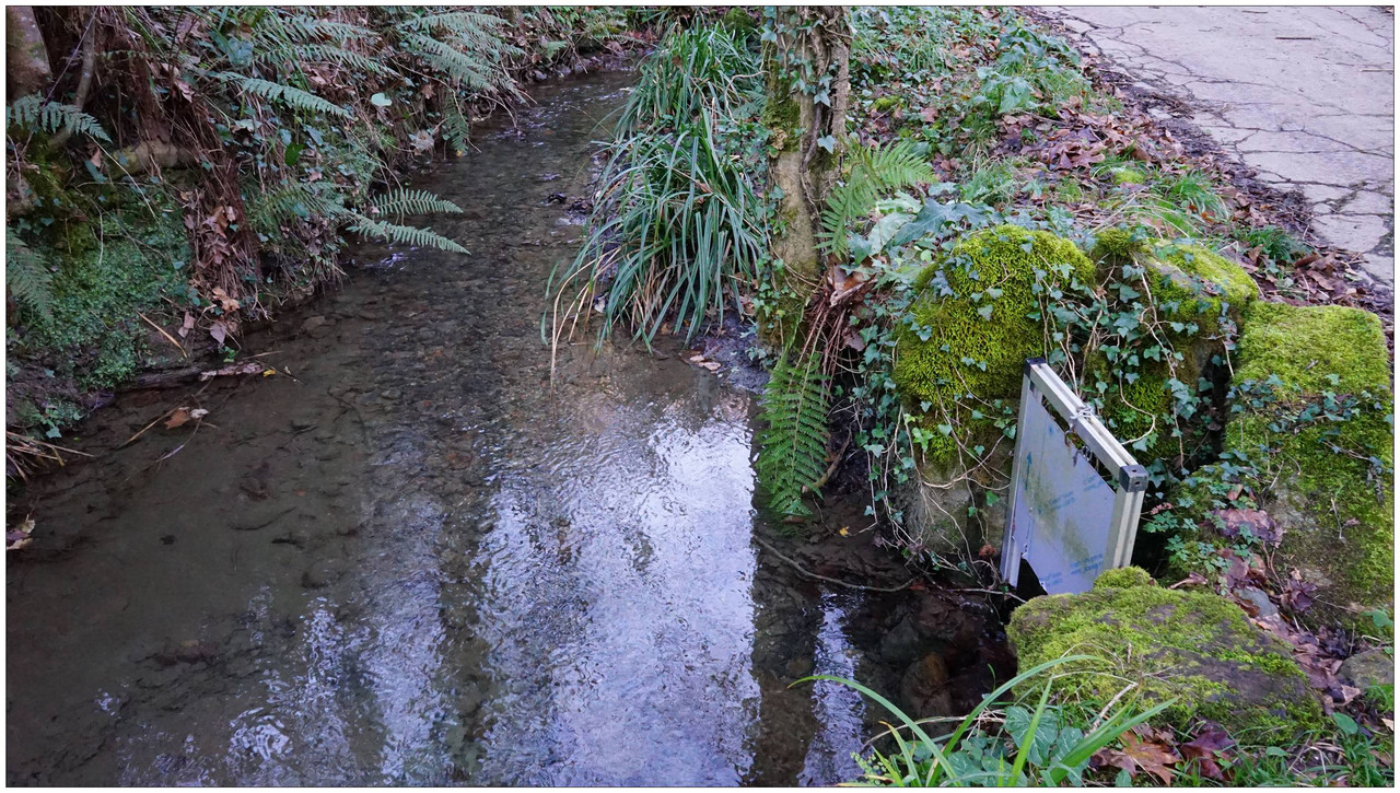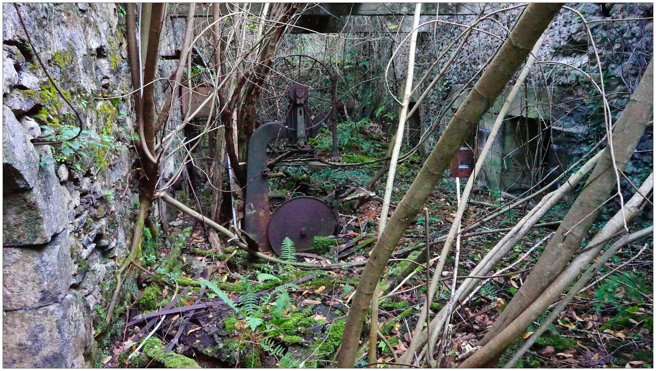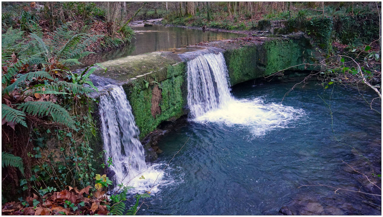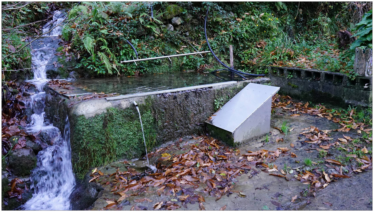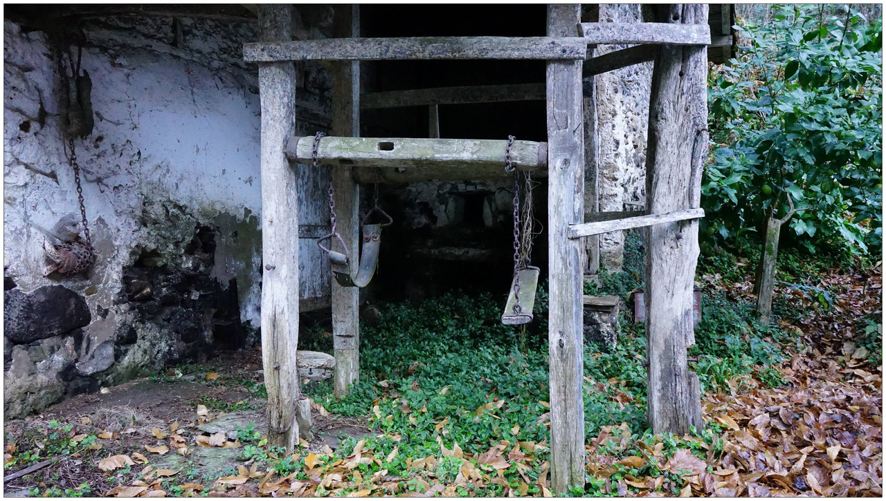 Poco después llegamos a Bekola, donde encontramos uno de los conjuntos más interesantes del recorrido: el azud, el canal de derivación y los restos de la ferrería de Bekola, con su antepara y un escudo de piedra en la fachada que indica el año 1734. Frente al caserío hay una fuente con lavadero y, junto a ella, un potro de herrar, utilizado antiguamente para inmovilizar a los animales.