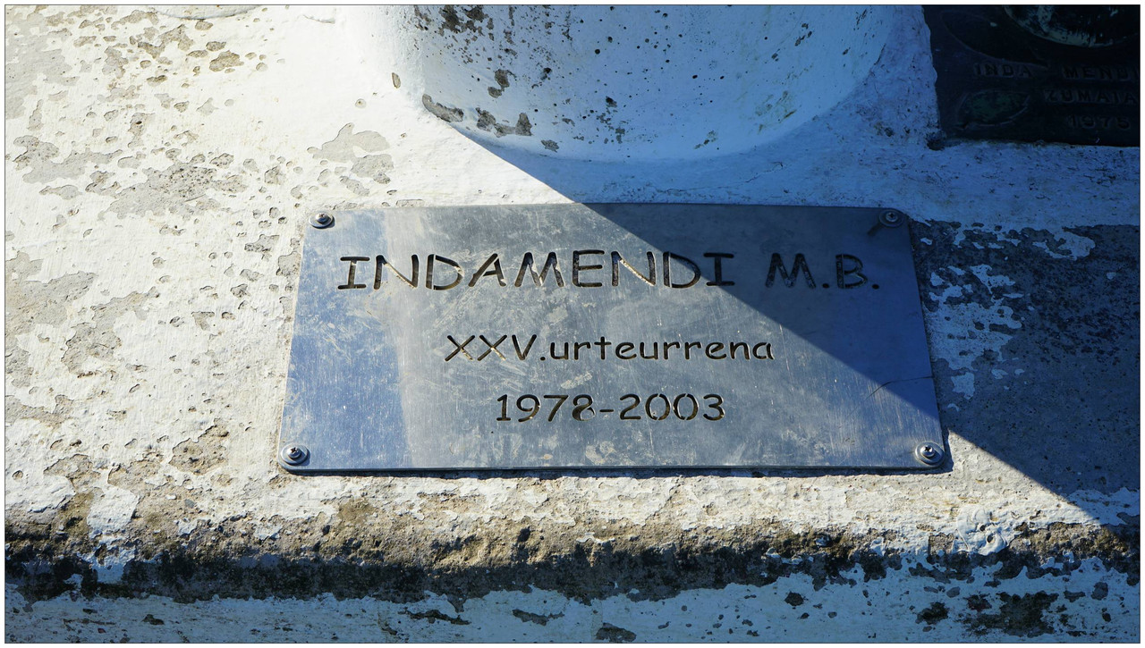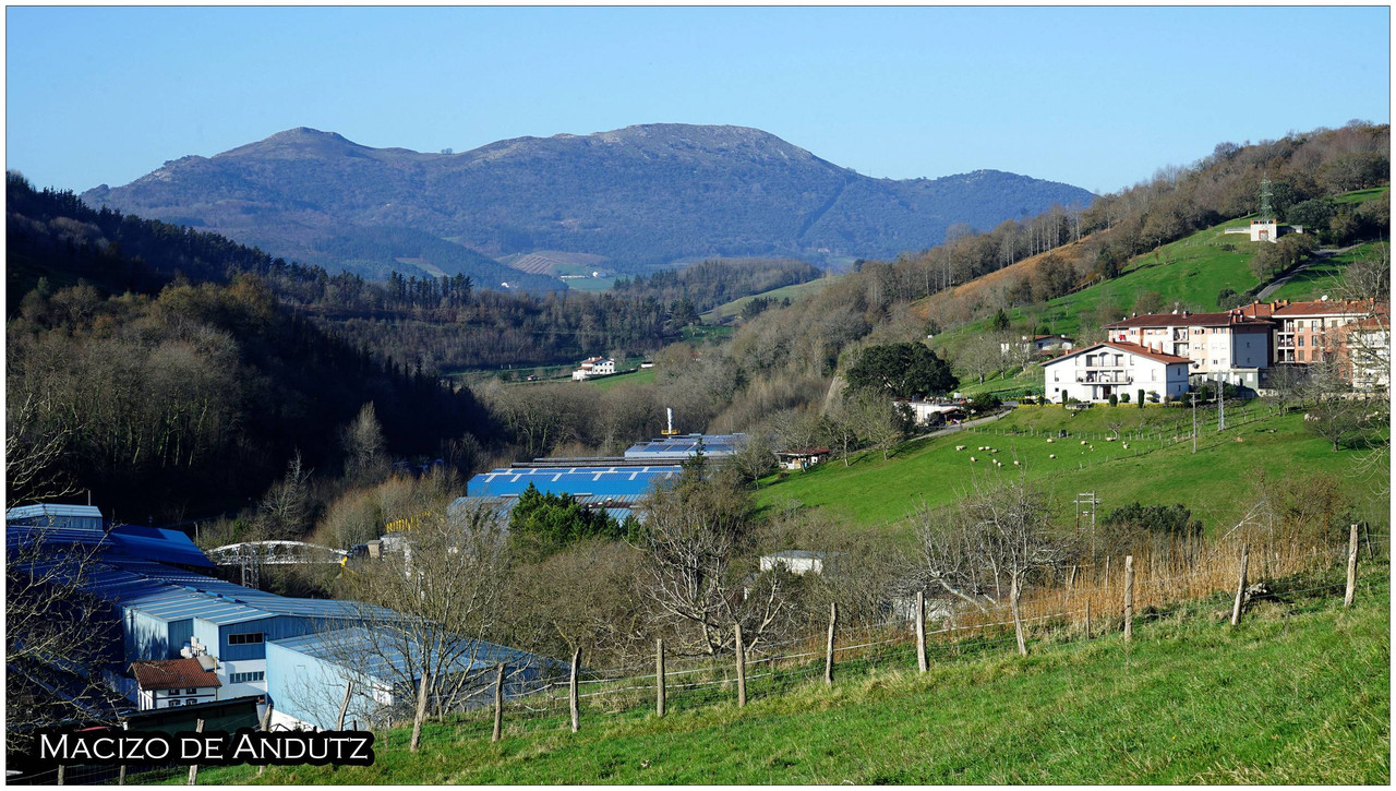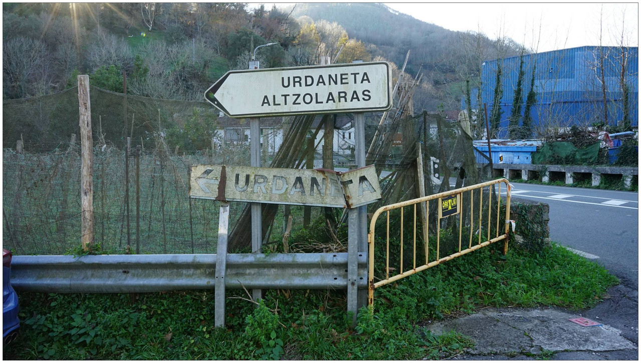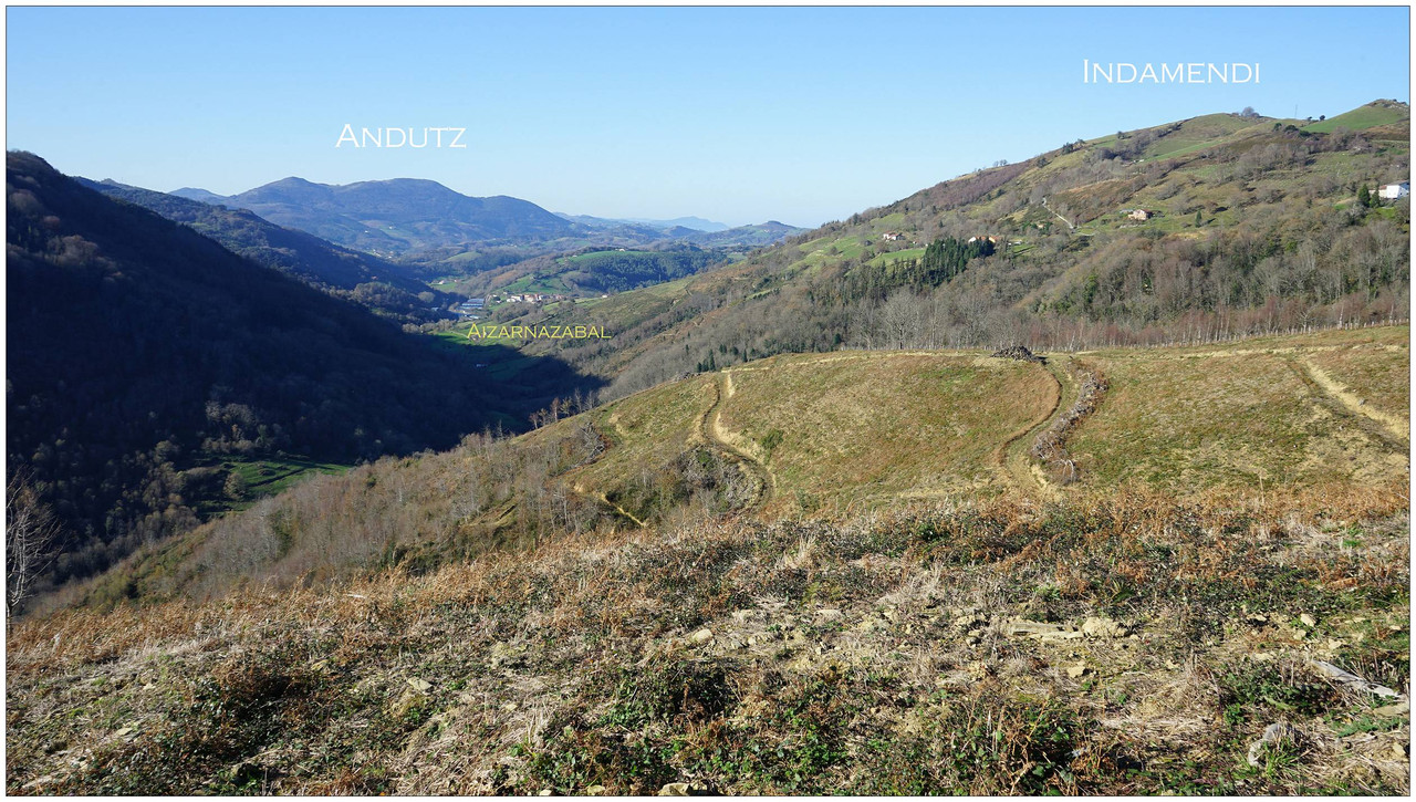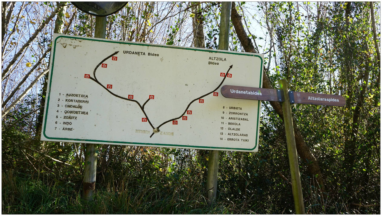 Tras la visita regresamos a la pista principal y continuamos hasta alcanzar un cruce desde el que parte la subida hacia Indamendi, entre varios caseríos asentados en la falda del monte. En este cruce encontramos un panel con los nombres de los caseríos y su ubicación. El camino por el que vamos a subir es el Urdanetabidea, mientras que el regreso lo realizaremos por el Altzolaraspidea, que recorre el fondo del valle y nos devolverá más adelante a Aizarnazabal.