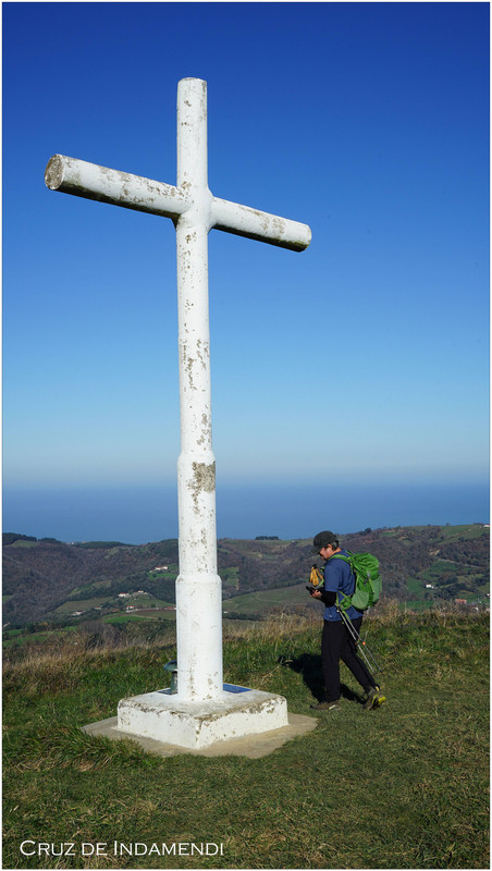 Las vistas desde la cima son magníficas: Zarautz, Zumaia, Pagoeta, Ernio, Izarraitz, Andutz, la costa guipuzcoana y, en días despejados, el inicio de la costa vizcaína. Desde el vértice geodésico nos acercamos a la Cruz de Indamendi, donde confluyen las mugas de Zestoa, Aizarnazabal y Aia. La cruz fue colocada en 1955 por el grupo montañero Oargi, y a sus pies se encuentra un buzón montañero con forma de hongo.