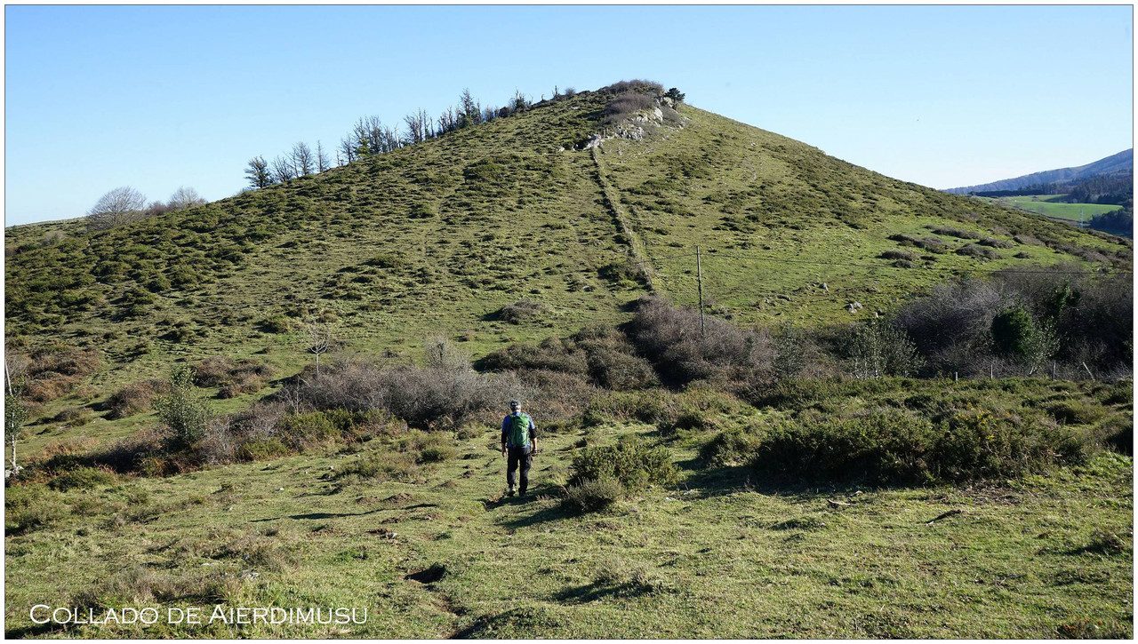Tras dejar atrás Goikoetxea, en una curva cerrada tomamos la pista que sigue ascendiendo hasta llegar al caserío Iroita-Azpi, punto donde finaliza el asfalto. A partir de aquí seguimos por un camino herboso, más rústico. Enseguida tomamos un desvío a la derecha (sur) y, pocos metros después, otro a la izquierda (sureste). Este tramo, en fuerte pendiente, enlaza con un camino que sube desde el barrio de Saiatz.